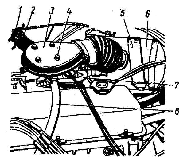 Рис. 2-2. Снятие воздушного фильтра с двигателя: 1 - зажим крепления рукава подвода холодного воздуха; 2 - рукав подвода холодного воздуха; 3 - подводящий фланец карбюратора; 4 - гайки крепления подводящего фланца; 5 - ремень крепления воздушного фильтра; 6 - воздушный фильтр; 7 - перепускной шланг системы вентиляции картера; 8 - шланг вентиляции картера