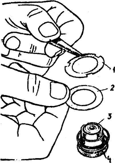 Рис. 4-20. Установка деталей впускного клапана на седло: 1 - дроссельный диск клапана отдачи; 2 - впускной клапан; 3 - седло клапана сжатия с клапаном сжатия в сборе; 4 - пружина впускного клапана