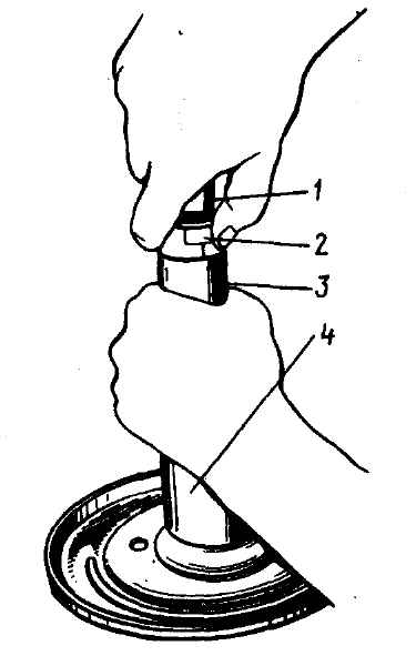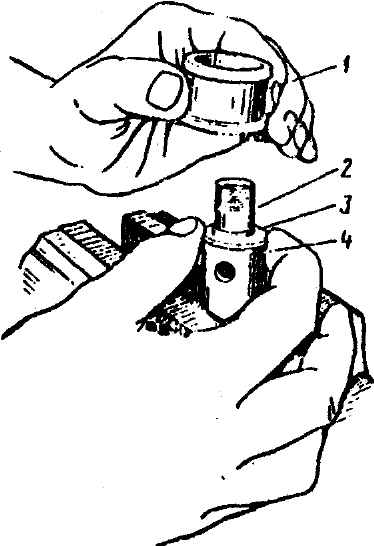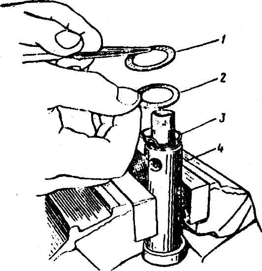 Рис. 4-26. Установка штока с поршнем в сборе и кольца поршня в рабочий цилиндр: 1 - шток с поршнем в сборе; 2 - кольцо поршня; 3 - рабочий цилиндр; 4 - резервуар При установке штока 1 (рис. 4-26) с поршнем в рабочий цилиндр 3 приподнять последний над резервуаром, поместить свертное фторопластовое кольцо 2 в проточку на поршне и, придерживая кольцо, ввести его вместе с поршнем в рабочий цилиндр, не допуская погружения штока в цилиндр глубже верхней поверхности ограничителя хода отбоя. В случае, если после этого шток будет стремиться опускаться в цилиндр, сделайте несколько возвратно-поступательных движений штоком относительно цилиндра, чтобы заполнить последний жидкостью из резервуара; - манжету штока и уплотнительное кольцо резервуара при ремонте рекомендуется заменять новыми; - рабочую поверхность манжеты (между уплотнительными кромками) заполните смесью 1,5 г дисульфида молибдена, ГОСТ 212-76 и 0,5 г амортизаторной жидкости (смесь консистенции густой сметаны), распределяя равномерно по внутренней поверхности манжеты;