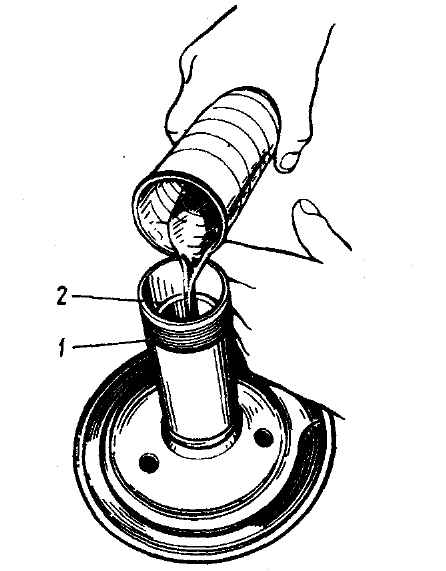 Рис. 4-25. Заливка амортизаторной жидкости: 1 - резервуар; 2 - рабочий цилиндр