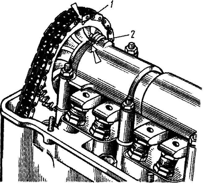 Рис. 2-18. Проверка совпадения установочной метки на звездочке распределительного вала с меткой на корпусе подшипников двигателя ВАЗ: 1 - метка на звездочке; 2 - метка на корпусе подшипников б) надеть цепь на звездочку распределительного вала и ввести в полость привода, устанавливая звездочку так, чтобы метка I (см. рис. 2-16) на ней совпала с меткой 2 на корпусе подшипников. Болт звездочки не затягивать до упора; в) установить звездочку на валик привода масляного насоса, также не затягивая окончательно болт крепления; г) установить башмак натяжителя цепи и натяжитель, не затягивая колпачковую гайку, чтобы пружина натяжителя могла прижать башмак; д) завернуть в блок цилиндров ограничительный палец цепи; е) повернуть коленчатый вал на два оборота в направлении вращения, что обеспечит нужное натяжение цепи, проверить совпадение меток на звездочке с метками на блоке цилиндров (см. рис. 2-18) и на корпусе подшипников (см. рис. 2-16); ж) если метки совпадают, то, заблокировав маховик фиксатором A.60330/R (см. рис. 2-6), окончательно затянуть болты звездочек и колпачковую гайку натяжителя цепи и отогнуть стопорные шайбы болтов звездочек; если метки не совпадают, то повторить операцию по установке цепи; - отрегулировать зазор между кулачками распределительного вала и рычагами привода клапанов; - установить крышку привода распределительного вала (рис. 2-19) с прокладкой и сальником на блок цилиндров, не затягивая окончательно болты и гайки крепления;