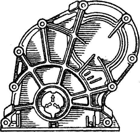 Рис. 2-19. Крышка привода распределительного вала двигателя ВАЗ. Стрелками показаны выступы для центрирования крышки относительно ступицы шкива коленчатого вала - оправкой 41.7853.4010 отцентровать положение крышки относительно конца коленчатого вала и затянуть окончательно гайки и болты ее крепления; - установить шкив коленчатого вала и завернуть храповик. Примечание. Проверку установки поршня первого цилиндра в положение ВМТ следует производить по установочным меткам, указанным на рис. 2-20;