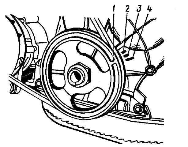 Рис. 2-20. Положение установочной метки на шкиве коленчатого вала двигателя ВАЗ в момент нахождения поршня первого цилиндра в ВМТ: 1 - метка на шкиве коленчатого вала; 2 - метка опережения зажигания на 10°; 3 - метка опережения зажигания на 5°; 4 - метка опережения зажигания на 0° - установить масляный фильтр, привернув его вручную к штуцеру на блоке цилиндров; - установить маслоотделитель вентиляции картера и крышку сапуна и закрепить фиксатор сливной трубки маслоотделителя; - установить масляный насос и масляный картер с прокладкой; - установить насос охлаждающей жидкости, кронштейн генератора и генератор. Надеть ремень на шкивы и отрегулировать его натяжение; - установить на головку блока цилиндров подводящую трубку радиатора отопителя и выпускной патрубок (см. рис. 2-5). Прикрепить к насосу охлаждающей жидкости и выпускному коллектору отводящую трубку радиатора отопителя. Установить термостат; - установить датчики контрольных приборов; - установить шестерню привода масляного насоса и распределителя зажигания; - установить распределитель зажигания и отрегулировать момент зажигания; - завернуть свечи зажигания и затянуть их динамометрическим ключом 67.7812.9515; - установить топливный насос в соответствии с указаниями (см. главу "Система питания); - установить карбюратор с прокладками и присоединить к нему шланги; - установить крышку головки блока цилиндров с прокладкой и кронштейном топливопровода; - установить передние опоры двигателя с подушками и с переходниками; - установить ведущий и ведомый диски сцепления. |