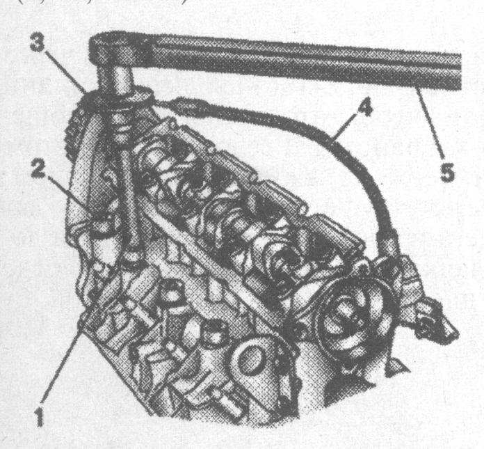 Рис. 2-131. Затягивание болтов крепления головки цилиндров двигателя F3R 272: 1 - специальный наконечник ключа; 2 - болт крепления головки блока; 3 - шкала угломера; 4 - стойка угломера; 5 - динамометрический ключ