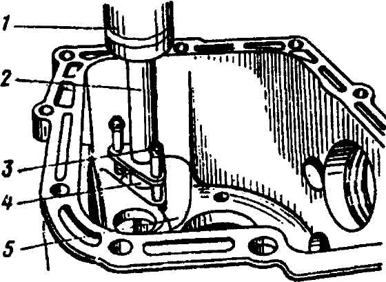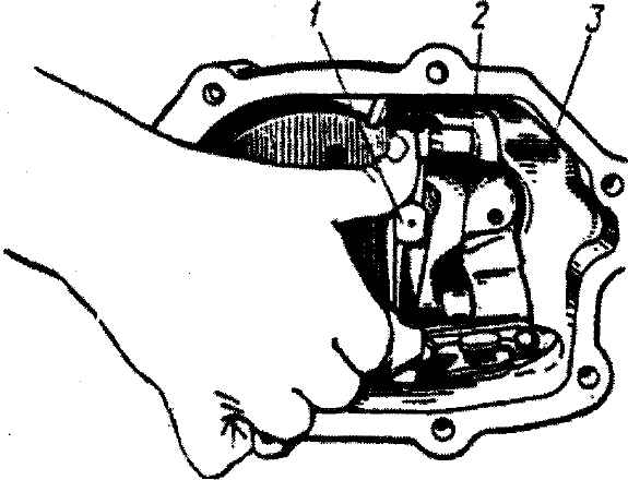 Рис. 3-93. Проверка взаимодействия переключателя передач с плунжерами: 1 - переключатель передач; 2 - плунжер; 3 - крышка Ввернуть в крышку четыре шпильки крепления задней опоры двигателя и включатель света заднего хода. Переключатель 1 (рис. 3-93) передач смазать моторным маслом и ввести в гнезда крышки 3, в которых переключатель должен легко перемещаться. Между плунжерами 2 и контактирующими поверхностями переключателя, при нейтральном его положении, должен оставаться зазор. После нажатия на плунжер 2 переключателем 1 и снятия с него усилия переключатель передач должен возвращаться в исходное нейтральное положение под воздействием соответствующего плунжера. В нейтральном положении переключатель должен легко перемещаться в осевом направлении. Механизм переключения передач устанавливается на коробку передач, у которой предварительно включают 4-ю передачу. Возможна установка и при нейтральном положении коробки передач. Выдвинутый за пределы торца крышки 5 (см. рис. 3-50) переключатель передач вводится кулаком в паз штока 6, после чего совмещаются торцы крышки и картера 1 и затягиваются болты крепления крышки. Возможен также следующий порядок сборки механизма: переключатель 2 (рис. 3-94) вводится кулаком 3 в паз штока 4, а затем крышка надвигается своими гнездами на вал переключателя передач