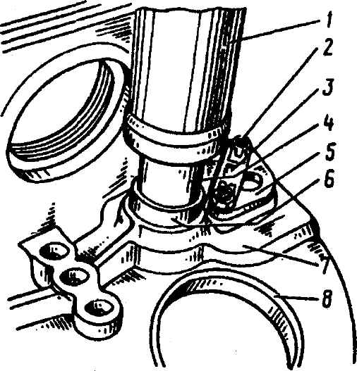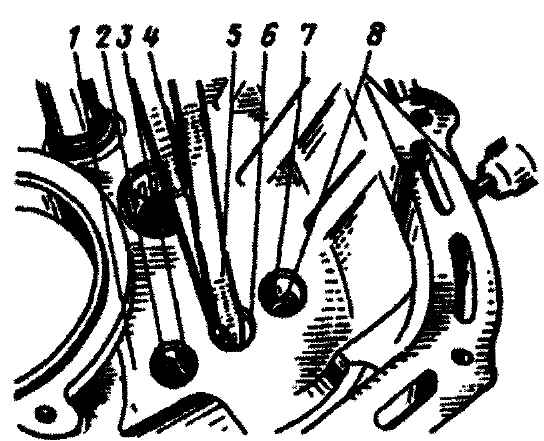 Рис. 3-70. Установка замка штоков 1-й - 2-й передач в гнездо картера главной передачи с применением пинцета и оправки (установка замка штоков 3, 4 и 5-й передач и заднего хода производится через направляющее отверстие под шток 5-й передачи и заднего хода): 1 - картер; 2 - направляющее отверстие штока 1-й - 2-й передач; 3 - направляющее отверстие замка штоков 1-й - 2-й и 3-й - 4-й передач; 4 - замок; 5 - пинцет; 6 - направляющее отверстие штока 3-й - 4-й передач; 7 - направляющее отверстие штока 5-й передачи и заднего хода; 8 - оправка для ввода замка в направляющее отверстие картера После запрессовки наружных колец 3 (рис. 3-111) подшипника 6 (см. рис. 3-69) в картер главной передачи зафиксировать их в осевом направлении соответственно: передний подшипник ведущей шестерни - стопором 1 (рис. 3-105), который должен войти в проточку кольца и фиксировать отгибанием "усов" стопорной шайбы 2 болт 3 крепления; средний подшипник первичного вала - винтом 5 (см. рис. 3-55), конус которого должен войти в кольцевую канавку на цилиндрической поверхности наружного кольца. Винт законтрить кернением. Проверить постановкой валов вращение сепараторов и роликов подшипников, которое должно быть легким и плавным. После запрессовки наружного кольца 2 (рис. 3-112) заднего подшипника ведущей шестерни и наружного кольца заднего подшипника 3 (рис. 3-71) первичного вала в картер коробки передач зафиксировать их пластиной. Перед постановкой пластины на подшипник первичного вала следует уложить заднее внутреннее кольцо.