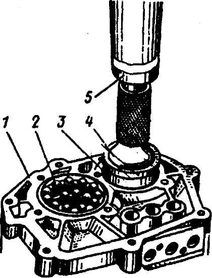 Рис. 3-71. Запрессовка наружного кольца заднего подшипника первичного вала в картер коробки передач: 1 - картер; 2 - задний подшипник ведущей шестерни главной передачи (вторичный вал); 3 - задний подшипник первичного вала; 4 - оправка 80-П162; 5 - поршень пресса Затяжку винтов крепления пластин к картеру производить в последовательности, указанной на рис. 3-59. Винты законтрить кернением. Установить на задний торец картера главной передачи прокладку, затем картер коробки передач, стянуть картеры болтами. Отрегулировать при необходимости осевое положение ведущей шестерни главной передачи в картерах по монтажному размеру, установить в картере собранный дифференциал и отрегулировать боковой зазор шестерен главной передачи. Работы производить в соответствии с главой "Главная передача и дифференциал". Синхронизаторы. Сборку синхронизаторов необходимо производить с применением специальных приспособлений, аналогичных для обоих типов конструкций (1-й - 4-й и 5-й передач). Раздача торцов пальцев производится способом радиальной клепки на специальных станках. Иной способ клепки недопустим, так как при этом деформируются кольца и не обеспечивается плотное закрепление пальцев в гнездах колец. Установить пальцы 3 (рис. 3-72) хвостовиками 4 в гнезда основания 1 приспособления и посредством пластин 2 сориентировать лыски на средней части пальцев в направлении к центру синхронизатора