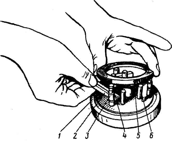 Рис. 3-72. Установка пальцев синхронизатора 1-й - 4-й передач в приспособление для сборки с их фиксацией по лыске посредством пластин и установка кольца (для синхронизатора 5-й передачи приспособление аналогично, только сборка при этом начинается с установки на пальцы упорного кольца): 1 - основание приспособления с отверстиями для базирования хвостовиков пальцев; 2 - пластина для ориентации лыски на пальце в направлении к центру синхронизатора; 3 - палец; 4 - хвостовик на торце пальца; 5 - кольцо синхронизатора (для синхронизатора 5-й передачи - стальное упорное кольцо); 6 - запрессованные в основание штифты, которые являются опорными для пластины 2 Надеть кольцо 5 синхронизатора (для синхронизатора 5-й передачи - стальное упорное кольцо) на хвостовики 4 пальцев. Запрессовать предварительно с усилием 3500 Н (350 кгс) кольцо 5 и упорное кольцо 6 (рис. 3-73) для синхронизаторов 5-й передачи на хвостовики пальцев. Завести пружину в муфту. Приемы заводки пружины в муфту синхронизатора 1-й - 4-й передач последовательно показаны на рис. 3-74 и 3-75. Пружина синхронизатора 5-й передачи вводится в паз муфты радиальным вращением. Сжать пружину и, надвигая муфту на пальцы, ввести пружину внутрь пальцев (рис. 3-76). Перевернуть синхронизатор и аналогично вышеописанному напрессовать на пальцы с усилием 13000 Н (1300 кгс) первое и второе кольца (рис. 3-77). Проследить, чтобы запрессовка колец велась до упора в торцы пальцев. Предупреждение. Не допускайте чрезмерных усилий прессования, приводящих к деформации колец. В приспособлениях, показанных на рис. 3-78 и 3-79, расклепать торцы пальцев методом радиальной клепки (рис. 3-80 и 3-81).
