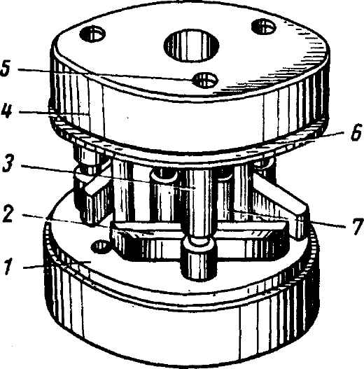 Рис. 3-73. Запрессовка с предварительным усилием 3500 Н (350 кгс) упорного кольца синхронизатора 5-й передачи на хвостовики пальцев (для синхронизатора 1-й - 4-й передач запрессовка производится аналогично, только при этом напрессовывается кольцо): 1 - основание приспособления; 2 - пластина для ориентации лыски на кольце в направлении к центру синхронизатора; 3 - палец синхронизатора; 4 - оправка пресса; 5 - отверстия в оправке для размещения в них хвостовика пальца; 6 - стальное упорное кольцо (для синхронизатора 1-й - 4-й передач - кольцо); 7 - запрессованные в основание штифты, которые являются опорными для пластины 2