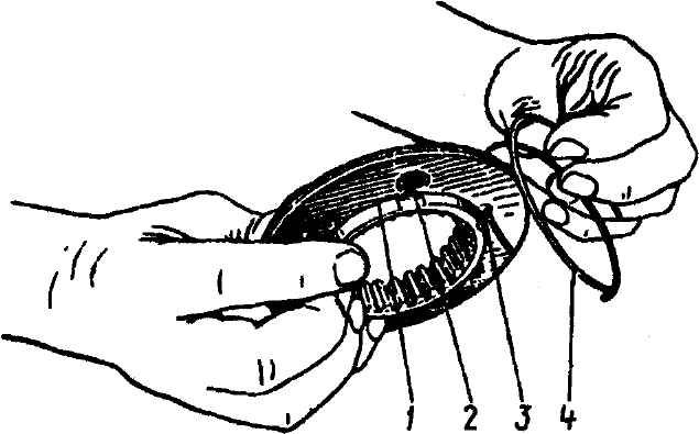 Рис. 3-74. Исходное положение при заводке пружины синхронизатора 1-й - 4-й передач в муфту: 1 - муфта; 2 - три отверстия в муфте под пальцы; 3 - отверстие под пружину; 4 - пружина в начальной стадии заводки ее в муфту
