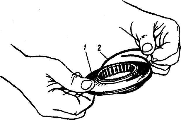 Рис. 3-75. Заправка ветвей пружины по обе стороны муфты синхронизатора 1-й - 4-й передач: 1 - муфта; 2 - пружина