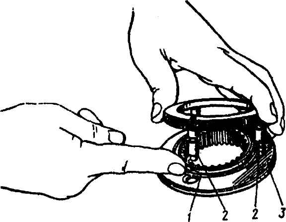 Рис. 3-76. Сжатие пружины синхронизатора 1-й - 4-й передач при вводе ее внутрь пальцев: 1 - пружина; 2 - пальцы; 3 - муфта