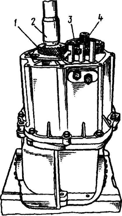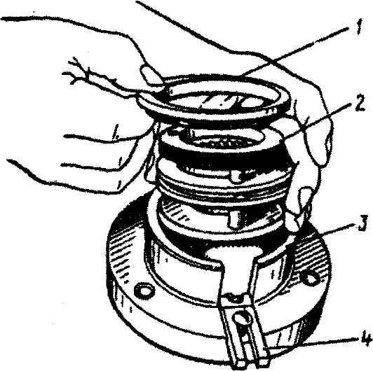 Рис. 3-79. Установка синхронизатора 5-й передачи в специальное приспособление для радиальной клепки пальцев (при этом пальцы должны упираться в основание 3 приспособления): 1 - втулка, с помощью которой базируется в приспособлении верхнее кольцо синхронизатора; 2 - кольцо; 3 - основание приспособления, обеспечивающее упор нижнего кольца и соосное расположение колец синхронизатора; 4 - движок для фиксации пальцев синхронизатора