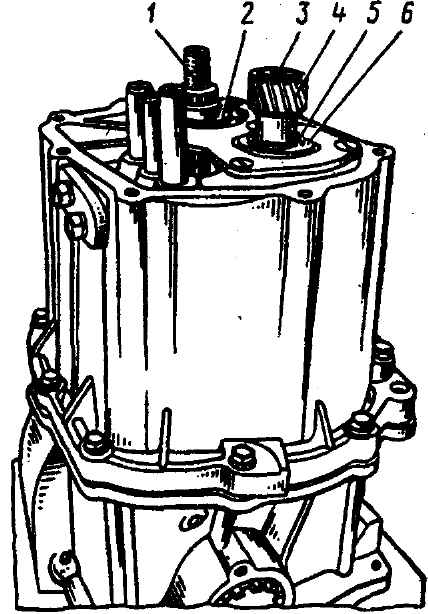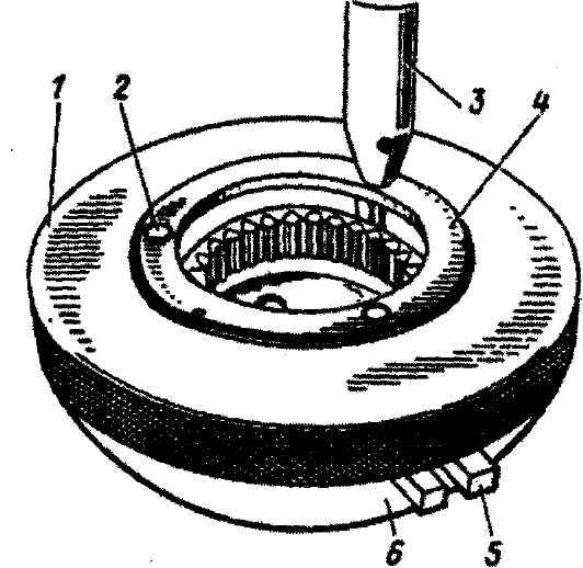 Рис. 3-81. Радиальная клепка пальцев синхронизатора 5-й передачи в приспособлении: 1 - втулка, с помощью которой базируется в приспособлении верхнее кольцо синхронизатора; 2 - расклепываемый хвостовик пальца; 3 - пуансон станка; 4 - верхнее кольцо синхронизатора (установлено концентрично нижнему); 5 - движок для фиксации пальцев синхронизатора; 6 - основание, обеспечивающее упор в торец пальца, базировку кольца синхронизатора и базировку втулки 1 После расклепки блокирующие пальцы должны плотно, без люфта удерживаться на кольцах. Торцы пальцев не должны выступать над поверхностью колец, а кольца не должны иметь остаточной деформации. Усилие перемещения муфты из нейтрального положения во включенное должно быть для синхронизаторов 1-й - 4-й передач 98-128 Н (10-13 кгс), 5-й передачи 118-137 Н (12-14 кгс). Муфта в нейтральном положении должна свободно перемещаться в радиальных направлениях относительно блокирующих пальцев. Валы. Прочистить отверстие - сапун в первичном валу и два радиальных отверстия во вторичном валу под шестернями 1-й и 2-й передач. Примечание. В осевом отверстии ведущей шестерни главной передачи запрессована пластина 1 (рис. 3-82), подводящая масло к шестерням 1-й и 2-й передач, закрытая запрессованной в торец вала шайбой.