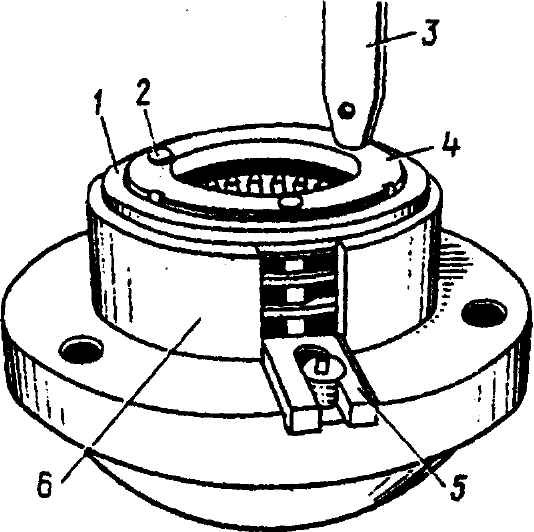 Рис. 3-80. Радиальная клепка пальцев синхронизатора 1-й - 4-й передач в приспособлении: 1 - втулка, с помощью которой базируется в приспособлении верхнее кольцо синхронизатора; 2 - расклепываемый хвостовик пальца; 3 - пуансон станка; 4 - верхнее кольцо синхронизатора (установлено концентрично нижнему); 5 - движок для фиксации пальцев синхронизатора; 6 - основание, обеспечивающее упор в торец пальца, базировку кольца синхронизатора и базировку втулки 1