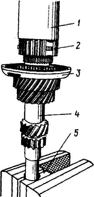 Рис. 3-83. Запрессовка ступицы синхронизатора 3-й - 4-й передач на первичный вал: 1 - оправка пресса; 2 - ступица; 3 - ведущая шестерня 3-й передачи; 4 - первичный вал; 5 - опора