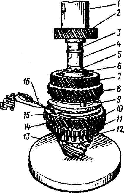 Рис. 3-84. Запрессовка шестерни 4-й передачи на вторичный вал (аналогично запрессовываются детали поз. 5, 7, 11, 12 и загороженная на рисунке синхронизатором ступица муфты синхронизатора 1-й - 2-й передачи): 1 - оправка пресса; 2 - шестерня 4-й передачи; 3 - шпонка; 4 - вал; 5 - стопорное кольцо; 6 - пружинная шайба; 7 - шестерня 3-й передачи; 8 - шестерня 2-й передачи; 9 - синхронизатор 1-й - 2-й передач; 10 - шестерня 1-й передачи; 11 - ведомая шестерня заднего хода; 12 - передний подшипник ведущей шестерни главной передачи (показан без наружного кольца); 13 - опора пресса; 14, 15 - торцы шестерни и кольца, по перепаду между которыми определяется износ конусов; 16 - индикатор для замера перепада между торцами конусов кольца и шестерни Установку стопорных колец для осевой фиксации на валах шестерен и ступиц производить специальными щипцами 2 (см. рис. 3-63) и оправкой 1 (см. рис. 3-84), преодолевая усилие пружинной шайбы 6 и не допуская при этом излишней деформации колец. Необходимо также следить, чтобы кольца входили в кольцевые канавки валов, а примыкающие к ступицам шестерни 2-й и 4-й передач не задевали поверхностью отверстий за стопорные кольца. Шпонки шестерен 3-й и 4-й передач должны плотно входить в пазы вала. Перед проверкой осевого свободного хода шестерен (рис. 3-85) и синхронизаторов (рис. 3-86) на первичный вал следует надеть упорную шайбу 4 (см. рис. 3-61), ориентируя ее наибольшим диаметром конуса в сторону шестерни, и следом за ней надеть переднее внутреннее кольцо 3 подшипника, прижав шайбу и кольцо к торцу вала оправкой 1 (см. рис. 3-85), а на вторичный вал следует запрессовать шестерню 7 (см. рис. 3-84). Шестерню надо ориентировать предварительно пазом по шпонке, запрессованной в паз вала. Также следует ориентировать по шпонке и шестерню 2. На вторичный вал надеть регулировочную шайбу и внутреннее кольцо подшипника.
