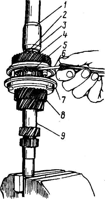 Рис. 3-85. Проверка щупом осевого свободного хода шестерни 4-й передачи на первичном валу. Проверка включения 3-й передачи (аналогично производится проверка осевого свободного хода шестерни 3-й и 5-й передач на первичном валу, 1-й - 2-й передач на вторичном валу и проверка включения передач): 1 - оправка, с помощью которой осуществляется осевой поджим деталей поз. 2 и 3; 2 - внутреннее кольцо переднего подшипника; 3 - упорная шайба 4-й передачи; 4 - шестерня 4-й передачи; 5 - ступица; 6 - щуп; 7 - муфта синхронизатора (для проверки свободного хода и включения муфту нужно переместить до упора в торец конуса шестерни); 8 - шестерня 3-й передачи; 9 - первичный вал