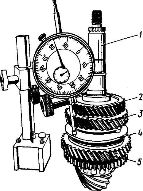 Рис. 3-86. Проверка индикатором осевого свободного хода синхронизатора 1-й - 2-й передач: 1 - вал; 2 - индикатор; 3 - шестерня 2-й передачи; 4 - муфта синхронизатора (для проверки свободного хода муфту вместе с пальцами, пружиной и кольцами следует переместить рукой до контакта с конусами противолежащих шестерен); 5 - шестерня 1-й передачи Муфты синхронизаторов должны под усилием руки перемещаться по шлицам ступиц и входить в зацепление со шлицами шестерен. Ограничением хода муфт должен являться упор в торцы конусов шестерен (см. рис. 3-85). После этой проверки муфты вывести в нейтральное положение. Установку валов, штоков и вилок в картер главной передачи удобно вести на специальном стенде 80-С007, при отсутствии стенда можно применять подставку 11 (см. рис. 3-61) под картер главной передачи, изготовленную в виде колодца, в пустотелой части которого должны разместиться первичный вал, штоки и ведомая шестерня главной передачи. Вставить в паз промежуточной шестерни 8 заднего хода вилку 10 и надеть шестерню на ось 9, сориентировав вилку бобышкой по отверстию под шток в картере. Ввести в зацепление соответствующие шестерни первичного 1 и вторичного 2 валов и соединенные таким образом валы ввести в картер 7 главной передачи, следя за тем, чтобы не повредить шейку под средний подшипник на первичном валу и наружное кольцо переднего подшипника вторичного вала. Для ограничения чрезмерного осевого перемещения первичного вала его передний торец должен упираться в технологический упор, размещенный внутри колодца колодки, а вторичный вал - в корпус дифференциала, который надо развернуть запрессованной в него осью сателлитов в направлении оси вала. Надеть вилку 7 (см. рис. 3-58) на муфту синхронизатора первичного вал. Шток 5 продеть через большое отверстие в вилке 3-й - 4-й передач и ввести через бобышку вилки 3 переключения шестерни заднего хода в направляющее отверстие в картере. Для ограничения при сборке его осевого положения, соответствующего нейтральному положению, передний торец штока должен упираться в технологический упор 80-П165 (аналогичные удаляемые упоры должны располагаться и под остальными двумя штоками), удаляемый при проверке переключения передач. Закрепить вилку заднего хода на штоке фиксатором 4. Для удобства выполнения этой операции промежуточную шестерню заднего хода можно переместить в крайнее верхнее положение с тем, чтобы фиксатор выдвинулся из полости картера. Вложить в отверстие штока 9 толкатель замков, укрепив его от выпадания смазкой ЛИТОЛ-24. Ввести шток через бобышку вилки 7 в направляющее отверстие в картере до положения, соответствующего нейтральному положению. Закрепить вилку на штоке фиксатором 4. Надеть вилку 6 на муфту синхронизатора вторичного вала. Ввести шток 10 через бобышку вилки в направляющее отверстие в картере до положения, соответствующего нейтральному положению. Закрепить вилку на штоке фиксатором 4. Прокладку, вошедшую в комплект картеров при регулировке монтажного размера, разместить на торце картера 2, сцентрировав ее по штифтам 8. Ввести магнит в ложемент, расположенный на дне картера главной передачи. Сборка коробки передач При сборке картера 1 (см. рис. 3-58), во избежание повреждения задних подшипников валов и гнезд под штоки в картере, требуется осуществлять центровку валов и штоков по соответствующим гнездам 