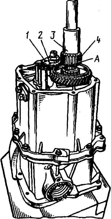 Рис. 3-88. Запрессовка ведомой шестерни 5-й передачи на ведущую шестерню главной передачи (вторичный вал): 1 - ведомая шестерня 5-й передачи; 2 - оправка пресса; 3 - ведущая шестерня 5-й передачи; 4 - первичный вал Ориентируя вырезанный частью А (рис. 3-89) внешних шлицев в сторону ведомой шестерни 5-й передачи, запрессовать на первичный вал ступицу 4, надеть на нее синхронизатор 1 (см. рис. 3-53) с вилкой 2, вставленной в паз муфты. При установке синхронизатора следует одновременно с постановкой муфты надевать вилку на шток.