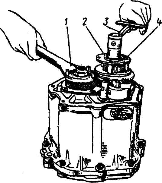 Рис. 3-90. Затяжка динамометрическим ключом болта крепления первичного вала с применением второго ключа, надетого на ведомую шестерню 5-й передачи (при включенной 5-й передаче): 1 - ключ со стержнями, входящими в гладкие отверстия ведомой шестерни 5-й передачи; 2 - ограничитель хода синхронизатора; 3 - динамометрический ключ, надетый на болт крепления первичного вала; 4 - муфта синхронизатора Проверить осевой свободный ход ведущей шестерни 5-й передачи (см. рис. 3-85), синхронизатора 5-й передачи (см. рис. 3-86), первичного и вторичного валов (рис 3-91). Муфта синхронизатора 5-й передачи должна от усилия руки перемещаться по шлицам ступицы и входить в зацепление со шлицами шестерни. Ограничением хода муфты должны являться упоры ее в торец шестерни и в ограничитель хода синхронизатора.