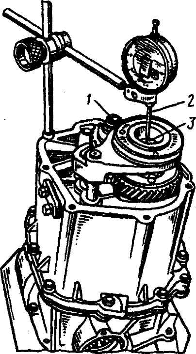 Рис. 3-91. Проверка осевого свободного хода первичного вала (для вторичного вала проверка производится аналогично): 1 - вторичный вал; 2 - индикатор; 3 - болт, ввернутый в первичный вал Перед этой проверкой необходимо удалить технологический упор штока. После окончания проверки муфту следует переместить в нейтральное положение. Сборка механизма переключения передач В случае замены в крышке металлокерамических втулок вала переключателя передач новые втулки перед запрессовкой в крышку следует выдержать в течение 10 мин. в масле ТАД-17И, нагретом до 100°C. Запрессованные втулки затем расточить на станке. После расклепывания торца ось механизма блокировки заднего хода должна плотно удерживаться на основании, а рычаг после поворота его в каждое из крайних положений возвращаться в исходное среднее положение под воздействием пружины. Рычаг в исходном положении при окружном покачивании его рукой не должен иметь свободного хода (см. рис. 3-67). Механизм закрепить на крышке болтами 6 (см. рис. 3-52), в случае применения стопора 4 - законтрить болты отгибанием его "усов" А на грани болтов. Уплотнительное кольцо 11 (см. рис. 3-51) переключателя перед сборкой смазать моторным маслом. Кольцо, установленное в канавку втулки, не должно иметь складок. В плунжер 19 включения заднего хода установить пружину 18 упора увеличенной размерности, а в плунжер 1-й - 2-й передач - пружину 15 малой размерности. Крышки 16 и 17 после запрессовки должны плотно удерживаться в гнездах крышки 7 и обеспечивать герметичность соединения. Для повышения надежности удержания крышек 2 (рис. 3-92) раскернить крышку 3 картера тремя равномерно распределенными по окружности крышки 2 кернениями суммарной длиной 15 мм. Для обеспечения герметичности стыки крышек 2 промазать герметиком.