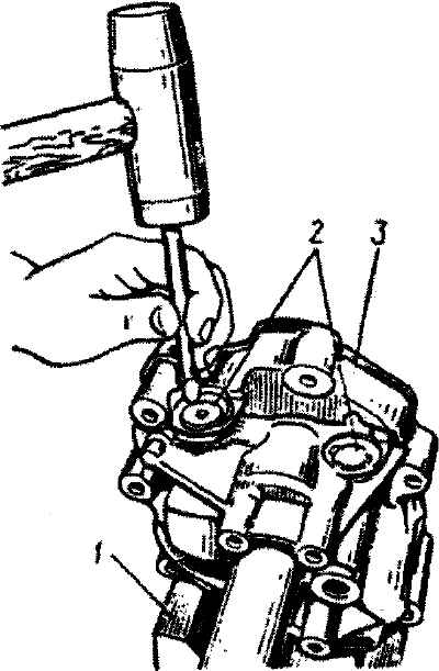 Рис. 3-92. Закрепление крышек плунжеров кернением крышки картера: 1 - опора; 2 - крышка плунжера; 3 - крышка картера