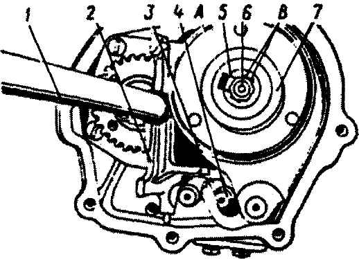 Рис. 3-94. Установка переключателя передач в шток перед монтажом крышки на картер коробки передач (фиксация болта крепления первичного вала): 1 - картер; 2 - переключатель; 3 - кулак переключателя, вводимый в паз штока включения 3-й - 4-й передач; 4 - шток включения 3-й - 4-й передач; 5 - стопор болта; 6 - болт крепления первичного вала; 7 - ограничитель; А - паз в ограничитель хода синхронизатора 5-й передачи, через который проходит хвостовик стопорной шайбы для фиксации его в пазу ступицы; В - "усы" стопора, отогнутые на грани болта Между картером и крышкой должна находиться прокладка. Закрепить на шпильках крышки кронштейн 3 (см. рис. 3-42) задней опоры двигателя. Надеть чехол 5 переключателя передач, следя за тем, чтобы его посадочные пояски разместились в проточках крышки и вала переключателя. Картер сцепления в сборе с вилкой, подшипником выключения сцепления и сальником первичного вала закрепить на картере главной передачи переднего моста, проложив между картерами прокладку. |