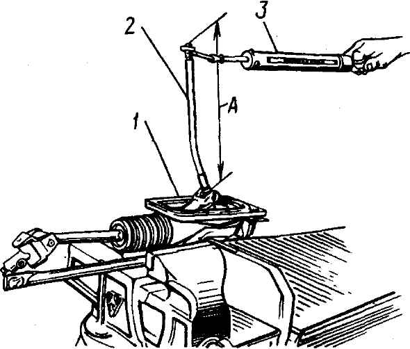 Рис. 3-99. Проверка динамометром усилия перемещения рычага при затяжке шарового шарнира: 1 - механизм управления; 2 - рычаг переключения; 3 - динамометр При монтаже чехлов, надеваемых на детали с большим растяжением, не допускать разрывов резины. Чехол вала управления можно надевать на вал с любой из сторон вала. Чехол шарового шарнира надевают на стеблевую часть рычага и затем перетаскивают его через бобышку под штифт. Чехлы должны надежно удерживаться на уплотняемых деталях. При сборке переднего шарнира вала 6 (см. рис. 3-97) переключения передач не повреждать пластмассовые втулки 7. Запрессовку оси 3 в крестовину 5 производить на прессе. После расклепки пустотелых хвостовиков осей вал переключения передач и наконечник 1 должны под воздействием руки перемещаться относительно крестовины, а пластмассовые втулки - оставаться неподвижными в гнездах корпусов. Разрыв металла расклепываемой части оси не допускается. Оси переднего шарнира не должны иметь осевого люфта. Перед сборкой вал 5 (см. рис. 3-95) переключения и рычаг 1 надо сцентрировать по отверстиям) оправкой диаметром 13,4, выводимой из отверстий деталей прессуемым штифтом. Запрессовку штифта в рычаг производить на прессе с опорой на рычаг, не повреждая пластмассовые втулки и вилку вала. После запрессовки штифт должен неподвижно удерживаться в рычаге управления и свободно поворачиваться во втулках вала, которые должны оставаться неподвижными в гнездах вилки вала. Свободный ход рычага вдоль оси штифта в вилке вала не допускается. Соединить уплотнитель с кожухом 3 (см. рис. 3-96) и с опорой 8 с помощью удерживающих выступов 2. Уплотнитель должен разместиться без складок и гофр в канавке кожуха, а его удерживающие элементы - выступы 2 уплотнителя - должны надежно скрепить кожух с опорой механизма. Не допускайте отрыва удерживающих элементов уплотнителя при проводке их через отверстия кожуха и опоры механизма. Чехол шарового шарнира должен надежно удерживаться своими посадочными поясками в проточке рычага, на корпусе шарового шарнира и на фланце кожуха механизма управления. После сборки механизма следует убедиться в легкости вращения всех его шарниров. Для предупреждения возможного соскакивания чехла шарового шарнира с корпуса при транспортировке собранного механизма, а также при установке его на автомобиль рекомендуется соединить между собой вал и тягу, а затем их временно скрепить, обвязав веревкой или проволокой. |