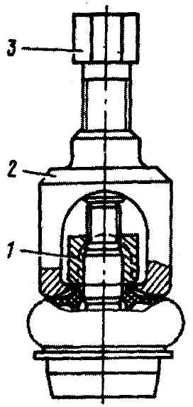 Рис. 5-5. Съемник для выпрессовки шарового шарнира из наконечника рулевой тяги: 1 - поворотный рычаг; 2 - корпус; 3 - винт - удалить шплинт-проволоку 58 (см. рис. 5-1) с грязезащитного чехла 60 и снять чехол и опорную шайбу 61; - сжать усики стопорного кольца 51 и вынуть его из наружного наконечника рулевой тяги; -удалить из наконечника заглушку 52, уплотнительное кольцо 57, пружину 53, нажимной 55 и нижний опорный 56 вкладыши, шаровой палец 54 и верхний опорный вкладыш 59. После разборки для проверки технического состояния шарового шарнира необходимо промыть полости наконечника рулевой тяги и все металлические детали в керосине. Резиновые и пластмассовые детали промыть в теплой воде и протереть чистой тряпкой. Внимательно осмотреть, нет ли на рабочих поверхностях шарового пальца 54, опорных вкладышах 56 и 59 и на посадочных местах наконечника 50 рулевой тяги следов износа, задиров или рисок. Изношенные и поврежденные детали заменить. Сборку шарового шарнира рулевой тяги необходимо проводить в следующем порядке: - вложить в наконечник рулевой тяги, предварительно смазав его, верхний опорный вкладыш, шаровой палец, нижний и нажимной вкладыши, пружину, уплотнительное кольцо и заглушку; - с помощью приспособления, показанного на рис. 5-6, или утопив заглушку отверткой и сжав усики стопорного кольца, установить стопорное кольцо в канавку наконечника;