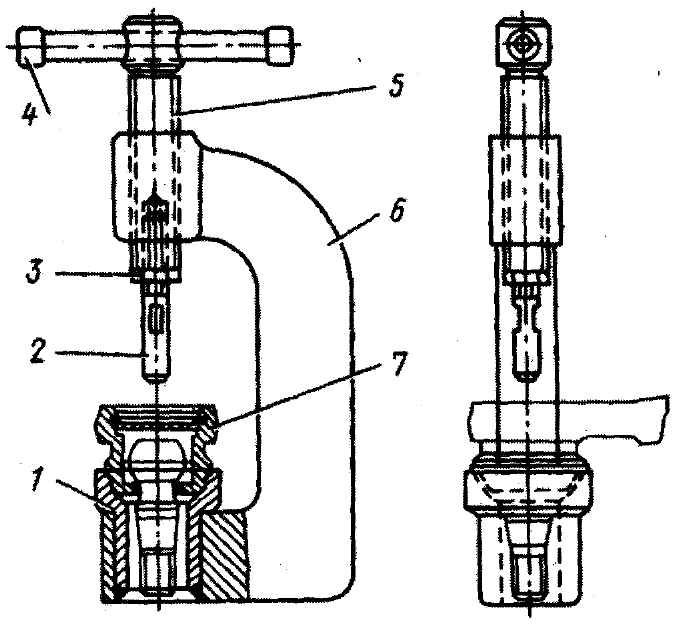 Рис. 5-6. Приспособление для сборки шарниров рулевых тяг: 1 - втулка с прорезью; 2 - стержень; 3 - контргайка; 4 - вороток; 5 - винт; 6 - корпус; 7 - наконечник рулевой тяги - покачивая шаровой палец рукой из одного крайнего положения в другое, убедиться в том, что для перемещения пальца требуется некоторое усилие. Если после замены изношенных деталей качание пальца все же будет очень легким, необходимо подложить под заглушку шайбу толщиной 0,5-2 мм и диаметром, равным диаметру заглушки. Осевое перемещение пальца не должно быть более 0,5 мм при усилии 80-100 Н (8-10 кгс); - надеть на палец опорную шайбу; - надеть на наконечник рулевой тяги полностью заполненный смазкой солидол жировой Ж грязезащитный чехол, аккуратно вложить в паз чехла проволоку, закрутить ее концы на два-три оборота и навернуть на резьбовой конец хвостовика шарового пальца гайку. Окончательную затяжку гайки производить после подсоединения шарового пальца к поворотному рычагу (на автомобиле), момент затяжки 30-40 Н·м (3-4 кгс·м). Гайку зашплинтовать. При износе, повреждении или разрушении резинометаллического шарнира 36 (см. рис. 5-4) выпрессовать его, использовав специальное приспособление 80-П125. Сборку шарнира производить на прессе специальными оправками приспособления 80-П125, при этом перед запрессовкой обильно смазать мыльной водой гнездо и наружную поверхность шарнира. Это облегчит запрессовку шарнира и предохранит его от повреждений. |