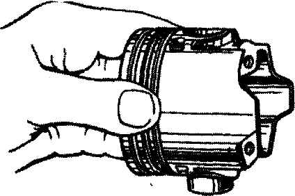 Рис. 2-25. Проверка посадки поршневого пальца двигателя ВАЗ Проверка зазоров между канавками и поршневыми кольцами Зазор по высоте между канавками и кольцами проверять, как показано на рис. 2-26, вставляя кольцо в соответствующую канавку. Монтажные и предельно допустимые зазоры для колец указаны в табл. 2-3. Зазор в замке поршневых колец проверять набором щупов, вставляя кольца в калибр, имевший диаметр отверстия, равный номинальному диаметру кольца с допуском +0,003 мм. Для. колец номинального размера можно применять калибр А.96137. Зазор должен быть в пределах 0,25-0,4 мм для всех колец. Если зазор недостаточный, следует запилить стыковые поверхности, а если повышенный - заменить кольца.