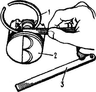 Рис. 2-26. Проверка зазора между поршневыми кольцами и канавками: 1 - поршневое кольцо; 2 - поршень; 3 - набор щупов