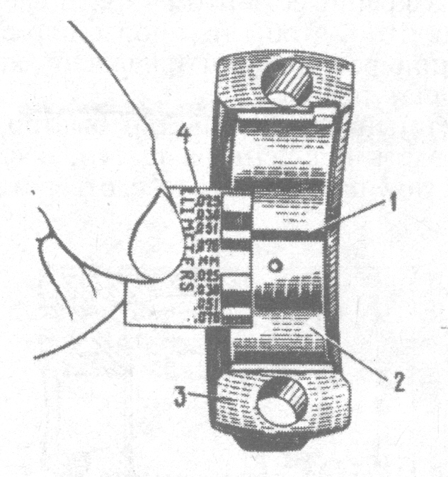 Рис. 2-27. Измерение зазора между шатунной шейкой и вкладышем с помощью калиброванной проволоки: 1 - калиброванная проволока; 2 - вкладыш; 3 - крышка шатуна; 4 - шкала для калиброванной проволоки Проверка зазора между вкладышами шатунных подшипников и коленчатым валом Зазор между вкладышами и шейкой коленчатого вала можно проверять расчетом (измерив детали) или калиброванной пластмассовой проволокой, для чего выполнить следующее: - тщательно очистить рабочую поверхность вкладышей и шатунной шейки и установить шатунно-поршневую группу на шейку коленчатого вала согласно нумерации; - поместить отрезок калиброванной проволоки на поверхность шатунной шейки, установить крышку шатуна на шатун и затянуть гайки. Момент затяжки 52 Н·м (5,2 кгс·м); - снять крышку и по шкале, нанесенной на упаковке, по сплющиванию проволоки (рис. 2-27) определить величину зазора. Номинальный монтажный зазор между вкладышами и шейками 0,036-0,086 мм. Если зазор не больше предельно допустимого при износе 0,1 мм, то можно установить эти вкладыши, не изменяя диаметр шатунных шеек. При зазоре больше предельно допустимого при износе 0,1 мм следует заменить вкладыши ремонтными (табл. 2-4) и прошлифовать шатунные шейки согласно данным на ремонтные размеры коленчатого вала (см. главу "Коленчатый вал и маховик"). Таблица 2-4. Номинальные и ремонтные размеры шеек коленчатого вала и вкладышей подшипников двигателя ВАЗ