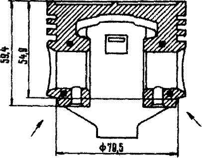 Контроль массы поршней. По массе поршни одного двигателя не должны отличаться друг от друга более чем на +2,5 г. Если нет комплекта поршней одной весовой группы, можно удалить часть металла с основания бобышек под поршневой палец. Места удаления металла указаны стрелками на рис. 2-28. Снятие металла, однако не должно превышать 4,5 мм по глубине относительно номинальной высоты поршня (59,4 мм), а по ширине ограничивается диаметром 70,5 мм.