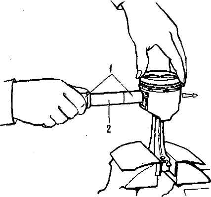 Рис. 2-28. Схема удаления металла с поршня двигателя ВАЗ для подгонки массы поршня. Стрелками указаны места, на которых можно удалять металл Сборка шатунно-поршневой группы Так как палец вставляется в верхнюю головку шатуна с натягом, то шатун необходимо нагреть до 240°C для расширения его головки. В печь, уже нагретую до 240°C, шатуны поместить на 15 мин. верхними головками, направленными во внутрь печи. Для правильного соединения пальца с шатуном следует запрессовывать палец как можно быстрее, так как шатун охлаждается быстро и после охлаждения шатуна нельзя будет изменить положение пальца. Палец надо заранее приготовить к сборке, надев его на валик 1 (рис. 2-29) приспособления А. 60325, установив на конце этого валика направляющую 3 и закрепив ее винтом 4. Винт следует затягивать неплотно, чтобы не произошло его заклинивания при расширении пальца от контакта с нагретым шатуном. Извлеченный из печи шатун быстро зажать в тисках. Надеть поршень на шатун, следя, чтобы отверстие под палец совпало с отверстием верхней головки шатуна. Приспособлением А.6032 закрепленный поршневой палец протолкнуть в отверстие поршня и верхнюю головку шатуна (рис. 2-30) так, чтобы заплечик приспособления соприкасался с поршнем. Во время этой операции поршень должен прижиматься бобышкой к верхней головке шатуна в направлении запрессовки пальца (показано стрелкой на рис. 2-30), что позволит пальцу занять правильное положение.
