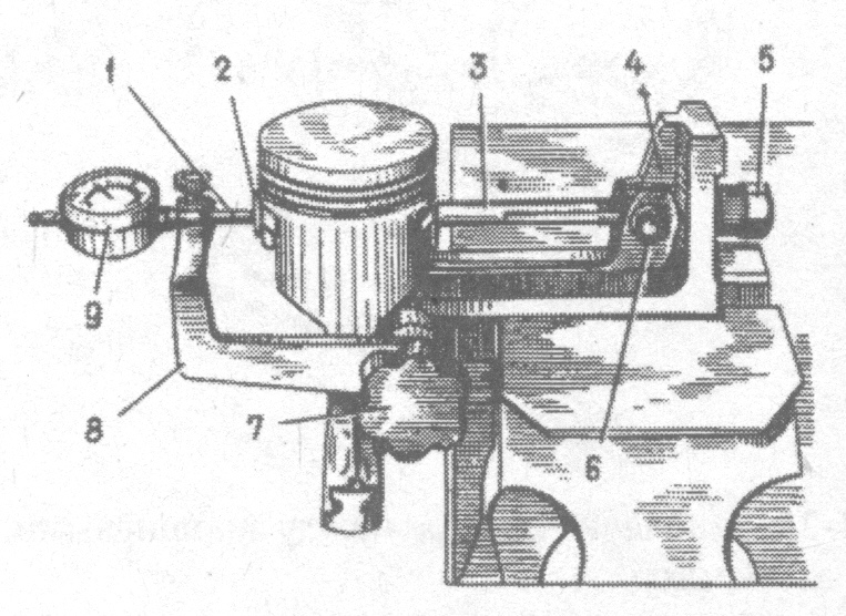 Рис. 2-30. Запрессовка поршневого пальца в верхнюю головку шатуна двигателя ВАЗ: 1 - приспособление А.60325; 2 - поршневой палец. Поршень должен опираться на головку шатуна в направлении, указанном стрелкой Предупреждение. 1. Поршень с шатуном должен соединяться так, чтобы метка "П" на поршне находилась со стороны выхода отверстия для масла на нижней головке шатуна. 2. После охлаждения шатуна палец смазать моторным маслом через отверстия в бобышках поршня. 3. При установке поршневых колец их замки располагать через 120°. Кольца устанавливать так, чтобы выточка на наружной поверхности второго (скребкового) компрессионного кольца была обращена вниз, а фаски на наружной поверхности маслосьемного кольца были обращены вверх. 4. Шатун обрабатывается вместе с его крышкой и поэтому крышки шатунов невзаимозаменяемы. Чтобы их не перепутать при сборке, на шатуне, в соответствующей ему крышке клеймится номер цилиндра, в который они устанавливаются. При сборке цифры на шатуне и крышке должны находиться с одной стороны. Проверка запрессовки пальца После сборки шатунно-поршневой группы проверить прочность запрессовки пальца с помощью динамометрического ключа и приспособления А.96615, для чего необходимо сделать следующее: - зажать основание 4 (рис. 2-31) приспособления в тиски и установить на нем шатунно-поршневую группу; - опустить кронштейн 8 индикатора, вставить в отверстие пальца резьбовой стержень 3 и продвинуть его в отверстие бобышки до упора головки 2 стержня в торец пальца; - на конец стержня навернуть гайку 5 и затянуть ее так, чтобы она, соприкасаясь с опорой, устранила возможные зазоры; - приподнять кронштейн 8 до горизонтального положения, закрепить его рукояткой 7 и установить штифт I индикатора 9 на головке 2 стержня, вставленного в палец; - установить индикатор на ноль и вставить в паз резьбового стержня упорный палец 6 так, чтобы стержень не проворачивался; - динамометрическим ключом затянуть гайку 5 стержня. Момент затяжки 13 Н·м (1,3 кгс·м). При этом обеспечивается осевая нагрузка 4000 Н (400 кгс). Посадка пальца в шатуне будет правильной, если после прекращения действия динамометрического ключа и возвращения гайки в исходное положение стрелка индикатора возвратится на ноль. В случае проскальзывания пальца в верхней головке шатуна необходимо заменить шатун новым.