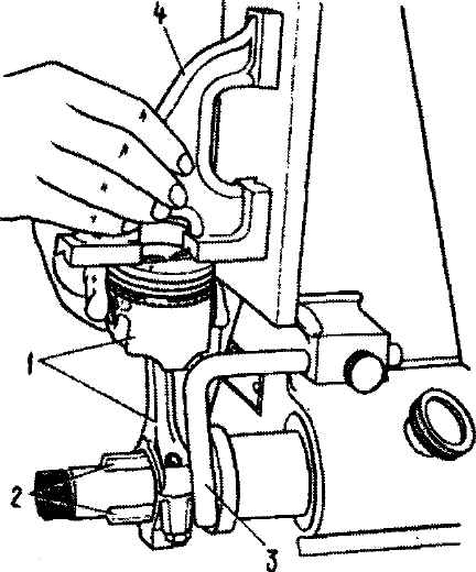 Рис. 2-32. Проверка параллельности поршневого пальца и нижней головки шатуна двигателя ВАЗ: 1 - собранный комплект шатун-палец-поршень; 2 - выдвижные ножи; 3 - упор; 4 - калибр |