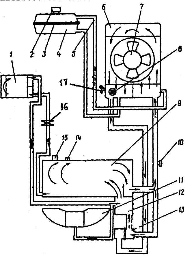Рис. 2-61. Принципиальная схема системы охлаждения автомобилей с двигателем ВАЗ: 1 - радиатор отопителя; 2 - пробка расширительного бачка; 3 - шов соединения верхней и нижней половин бачка; 4 - расширительный бачок; 5 - пароотводящая трубка; 6 - радиатор системы охлаждения; 7 - электровентилятор; 8 - датчик включения электровентилятора; 9 - двигатель; 10 - пробка для выпуска воздуха из системы при заправке; 11 - впускная труба двигателя; 12 - насос охлаждающей жидкости; 13 - термостат; 14 - пробка для слива жидкости из двигателя; 15 - датчик указателя температуры охлаждающей жидкости; 16 - кран отопителя; 17 - пробка сливная радиатора Проверка уровня и плотности охлаждающей жидкости В полностью заправленной системе охлаждения уровень жидкости в расширительном бачке на холодном двигателе должен быть на 5-10 мм выше соединительного шва 3 (см. рис. 2-61) верхних и нижних половин бачка. Предупреждение. Уровень охлаждающей жидкости проверять на холодном двигателе при температуре 15-20°C. так как при нагревании объем жидкости увеличивается и у прогретого двигателя ее уровень может значительно подняться. При необходимости можно проверить денсиметром плотность охлаждающей жидкости, которая должна быть 1,075-1,085 г/см3 для жидкости ТОСОЛ-А40. Если уровень жидкости в бачке ниже нормы, а плотность выше, то долить дистиллированную воду, а если плотность нормальная - долить ТОСОЛ-А40. При плотности жидкости в системе ниже нормы - долить в систему жидкость ТОСОЛ-А40 или заменить всю охлаждающую жидкость. Замена охлаждающей жидкости Замену охлаждающей жидкости необходимо производить в следующем порядке: - поставить под двигатель емкость для слива жидкости; - вывернуть пробку 14 (см. рис. 2-61) сливного отверстия в блоке цилиндров; - вывернуть сливную пробку 17 (см. рис. 2-61) слива охлаждающей жидкости из радиатора; - отвернуть пробку 2 расширительного бачка; Предупреждение. В медно-латунном радиаторе за счет сил поверхностного натяжения в горизонтальных трубках удерживается некоторое количество жидкости. Чтобы удалить оставшуюся жидкость, следует продуть радиатор сжатым воздухом под давлением 80-100 кПа (0,8-1,0 кгс/см2). Подачу сжатого воздуха в радиатор надо производить через пароотводящую трубку, для чего снять один ее конец с верхнего патрубка расширительного бачка; - по окончании слива жидкости из системы охлаждения двигателя завернуть пробки, снятые с блока и радиатора; - заполнить систему чистой водой через наливную горловину расширительного бачка 4 (см. рис. 2-61) таким образом, чтобы уровень был выше соединительного шва 3 на 5-10 мм. Затем следует завернуть пробку 2. Примечание. При заправке жидкостью системы охлаждения двигателя необходимо из пластмассового патрубка, расположенного в ветви подачи жидкости из двигателя в радиатор, вывернуть пробку 10 (рис. 2-61) для спуска воздуха. После заправки пробку завернуть на место; - пустить двигатель, прогреть его при средней частоте вращения коленчатого вала. При этом вода будет циркулировать по большому кругу, промывая радиатор; - остановить двигатель, слить воду, снова заполнить систему и повторить промывку; - после повторной промывки слить воду, продуть радиатор; - залить охлаждающую жидкость ТОСОЛ-А40, пустить двигатель и дать, ему поработать 2-3 мин. при повышенной частоте вращения (2500-3500 мин-1) коленчатого вала на холостом ходу для определения г