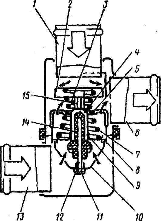 Рис. 2-63. Термостат: 1 - входной патрубок (от двигателя); 2 - байпасный клапан; 3 - пружина байпасного клапана; 4 - стакан; 5 - резиновая вставка; 6 - выходной патрубок; 7 - пружина основного клапана; 8 - седло основного клапана; 9 - тарелка основного клапана; 10 - держатель; 11 - регулировочная гайка; 12 - поршень; 13 - входной патрубок от радиатора; 14 - наполнитель; 15 - обойма Насос охлаждающей жидкости двигателя Снятие насоса Снятие насоса необходимо производить в следующем порядке: - слить охлаждающую жидкость из двигателя; - отсоединить от насоса муфту, соединяющую термостат с насосом; - отсоединить от насоса и выпускного коллектора отводную трубку из радиатора отопителя и снять насос. Разборка насоса Разборку насоса необходимо производить в следующем порядке: - отсоединить корпус 1 (рис. 2-64) насоса от крышки 6; закрепить крышку в тисках, использовав прокладки, и снять крыльчатку 9 с валиком съемником А.40026 (рис. 2-65); - снять ступицу 2 (рис. 2-66) шкива вентилятора с валика при помощи приспособления А.40005/115; - вывернуть стопорный винт 5 (см. рис. 2-64) и вынуть подшипник 2 с валиком 7 насоса; удалить сальник 8 из крышки 6 корпуса.