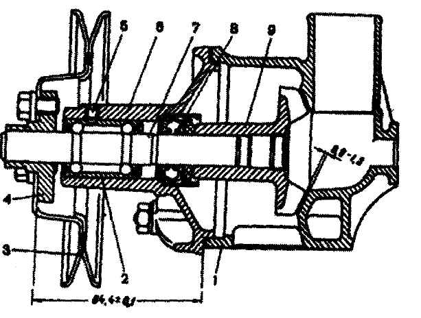 Рис. 2-64. Насос охлаждающей жидкости двигателя ВАЗ: 1 - корпус; 2 - подшипник; 3 - шкив; 4 - ступица шкива; 5 - стопорный винт; 6 - крышка корпуса; 7 - валик; 8 - сальник; 9 - крыльчатка