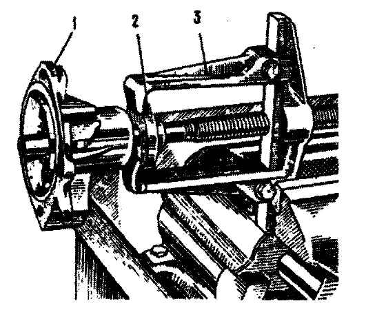 Рис. 2-66. Снятие ступицы шкива насоса: 1 - крышка корпуса; 2 - ступица шкива; 3 - съемник Проверка насоса Проверить осевой зазор в подшипнике [он не должен превышать 0,13 мм при нагрузке 50 Н (5 кгс)], особенно если отмечался значительный шум насоса. При необходимости подшипник заменить. Сальник насоса и прокладку между насосом и блоком цилиндров при ремонте рекомендуется заменять. Осмотреть корпус и крышку насоса. Деформации или трещины не допускаются Сборка насоса Сборку насоса необходимо производить в следующем порядке: - установить оправкой сальник, не допуская его перекоса, в крышку корпуса; - запрессовать подшипник с валиком в крышку так, чтобы гнездо стопорного винта совпало с отверстием в крышке корпуса; - завернуть стопорный винт подшипника и зачеканить контуры гнезда винта, чтобы он не отворачивался; - напрессовать ступицу 2 (рис. 2-67) шкива на валик 3 с помощью приспособления А.60430, выдержав размер (84,4+0,1) мм; - напрессовать крыльчатку на валик с помощью приспособления А.60430, обеспечив зазор 0,9-1,3 мм (см. рис. 2-64) между лопатками крыльчатки и корпусом насоса; - собрать корпус насоса с крышкой, установив между ними прокладку.