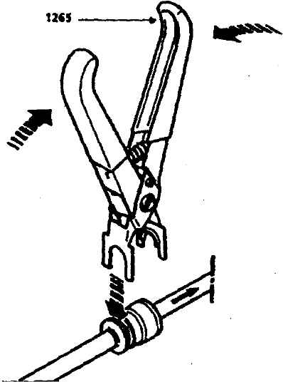 Рис. 2-159. Специальные щипцы для разъединения топливных шлангов Снятие и установка топливного бака осуществляется аналогично автомобилям с двигателями ВАЗ и УЗАМ. Для демонтажа с автомобиля топливного бака нужно предварительно ослабить стяжные хомуты шланга от топливного насоса к фильтру. Предупреждение. В топливпроводе топливо находится под высоким остаточным давлением. Поэтому шланг со штуцера топливного фильтра необходимо снимать медленно, стараясь постепенно понизить давление и поставив емкость для сливаемого топлива. Затем отсоединить провода от датчика указателя уровня топлива, предварительно сняв крышку люка пола над топливным баком и, поворачивая отверткой за выступ против часовой стрелки корпус датчика, вынимать его из бака. Снять шланг заливной горловины и воздушной грубки. Отвернуть гайки стяжных лент крепления бензобака и опустить бензобак на специальную подставку на уровне ниже штатного положения на 150 мм, чтобы была возможность отсоединить топливный насос. Для этого нажать на проволочную скобу и отсоединить электрический разъем, а нажав отверткой на фиксаторы наконечников бензошлангов, снять их со штуцеров. Схема подсоединения топливного насоса показана на рис. 2-160.