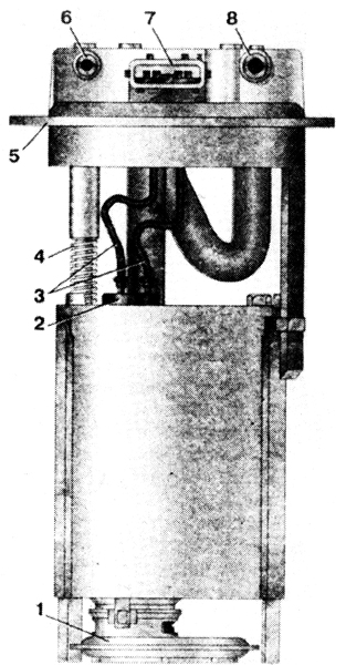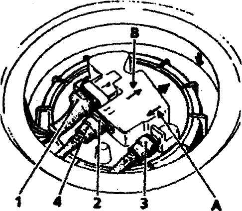 Рис. 2-160. Схема подсоединения топливного насоса: 1 - штекер; 2 - фиксирующий язычок; 3 - шланг подачи топлива; 4 - шланг возврата топлива; А и В - направление подачи топлива Для снятия топливного насоса необходимо отвернуть шесть гаек прижимного кольца и снять насос, обратив внимание на уплотнительное кольцо между корпусом топливного насоса и фланцем бензобака. Очистка бака и его ремонт аналогичны способам, описанным в разделах "Системы питания" для двигателей ВАЗ и УЗАМ. Топливный насос Топливный насос - электрический, роторный с внутренним зацеплением. Рабочее давление 0,3 МПа (3 кгс/см2), производительность 80 л/ч. Для устойчивой работы насоса в баке должно быть достаточно топлива (не менее 6-8 л), так как при отсутствии должного количества топлива в баке насос может выйти из строя из-за перегрева. Фланец 5 топливного насоса (рис. 2-161) закреплен на фланце отверстия топливного бака. Нижний торец корпуса насоса, установленного на пружинной стойке 4, упирается в дно топливного бака выступами топливозаборника 1 таким образом, что насос оказывается зажат между верхней частью и дном бака.