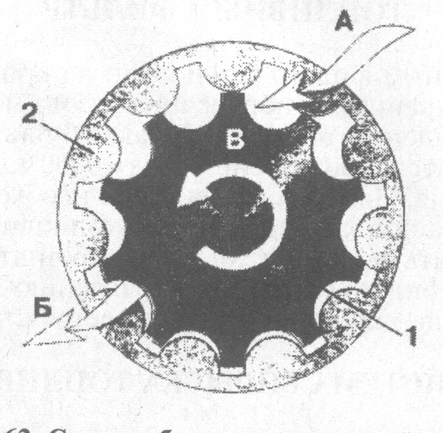 Рис. 2-162. Схема работы нагнетательной группы электрического топливного насоса системы питания двигателя F3R: 1 - ротор; 2 - обойма ротора; А - направление подачи топлива; Б - направление выхода топлива; В - направление вращения ротора В корпусе насоса находятся обратный и перепускной клапаны. При этом обратный клапан препятствует сливу топлива из топливопровода высокого давления в бак после остановки двигателя, а перепускной клапан ограничивает давление топлива в системе, обеспечивая при давлении выше 0,3 МПа (3 кгс/см2) циркуляцию топлива из зоны нагнетания в зону всасывания. При выходе из строя топливного насоса или снижении его производительности, вызванном засорением сетчатого фильтра, окислением коллектора или износом деталей нагнетательного узла, будет затруднен (или невозможен совсем) запуск двигателя, а также будет наблюдаться его неудовлетворительная работа на всех режимах.