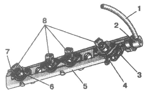 Рис. 2-164. Топливная рейка в сборе с форсунками и регулятором давления: 1 - вакуумный шланг регулятора давления топлива; 2 - регулятор давления топлива; 3 - отводящий штуцер; 4 - подводящий штуцер; 5 - провод двигателя; 6 - фиксатор форсунки и регулятора давления топлива; 7 - винт; 8 - форсунки