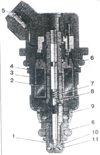 Рис. 2-165. Форсунка системы впрыска топлива двигателя F3R: 1 - игла запорного клапана; 2 - обмотка электромагнита; 3 - корпус; 4 - пружинное центрирующее кольцо: 5 - штекерный вывод обмотки электромагнита; 6 - уплотнительное кольцо; 7 - пружина; 8 - сердечник; 9 - фильтр; 10 - корпус клапана-распылителя; 11 - диффузор распылителя Форсунки (рис. 2-165) служат для дозированного впрыска топлива в цилиндры двигателя и представляют собой высокоточный электромеханический клапан. Топливо к форсункам поступает через фильтр 9 по каналу к запорному клапану под давлением 0,28-0,33 МПа (2,8-3,3 кгс/м2). Пружина 7 прижимает иглу 1 к конусному отверстию корпуса 10 клапана, удерживая клапан в закрытом состоянии. При подаче напряжения от блока управления двигателем через штекерный вывод 5 на обмотку 2 электромагнита в последней создается магнитное поле, втягивающее сердечник 8 вместе со связанной с ним иглой 1 внутрь электромагнита. Конусное кольцевое отверстие в корпусе распылителя открывается и топливо впрыскивается через диффузор 11 во впускной канал головки блока цилиндров и далее в цилиндр двигателя. Количество подаваемого в цилиндр топлива зависит от длительности электрического импульса, подаваемого в обмотку электромагнита форсунки блоком управления двигателем. После прекращения поступления электрического импульса пружина 7 возвращает сердечник 8 и связанную с ним иглу 1 в исходное состояние - клапан запирается. Регулятор давления топлива поддерживает постоянное давление в центральном канале топливной рейки (см. рис. 2-158) двигателя. Электрический топливный насос имеет производительность большую, чем это необходимо для обеспечения работоспособности системы, а давление топлива, подаваемого в форсунки на всех режимах работы двигателя, должно быть 0,3 МПа (3 кгс/см2). Регулирование давления основано на принципе слежения за значением соотношения давления в топливной рейке 7 двигателя и воздушном ресивере. В процессе работы регулятора давления часть топлива через сливной трубопровод 9 постоянно сливается в топливный бак. В зависимости от разрежения в воздушном ресивере регулятор давления уменьшает или увеличивает количество сливаемого излишнего топлива, поддерживая постоянное давление в топливной рейке 7 двигателя. Регулятор давления представляет собой корпус, имеющий замкнутую полость, разделенную мембраной на вакуумную и топливную камеры. Вакуумная камера сообщается с воздушным ресивером двигателя через резиновый трубопровод, топливная - с полостью топливной рейки двигателя через выполненный внутри последнего канал, в который входит подпружиненный упор клапана регулятора. При работе двигателя упор под действием пружины прижат к седлу, выполненному в канале топливной рейки двигателя, если перепад давления в воздушном ресивере и топливной рейке двигателя меньше или равен 0,3 МПа (3 кгс/см2). Обратного слива при этом нет и давление в топливной рейке начинает повышаться. Если перепад давления более 0,3 МПа (3 кгс/см2), мембрана регулятора прогибается и в клапане появляется зазор, через который в отводящий штуцер топливной рейки двигателя сливается излишек топлива - давление снижается. С увеличением нагрузки на двигатель, работающий при большом открытии дроссельной заслонки, расход топлива возрастает, вследствие чего падает давление в топливной рейке двигат