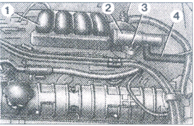 Рис. 2-166. Расположение регулятора холостого хода на двигателе F3R: 1 - воздушный ресивер двигателя; 2 - регулятор холостого хода; 3 - болт крепления регулятора; 4 - шланг подвода дополнительного воздуха