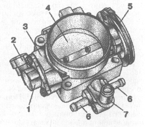 Рис. 2-167. Регулятор холостого хода двигателя F3R: 1 - штекерные выводы обмотки электромагнита; 2 - демпфирующая пружина; 3 - сердечник; 4 - обмотка электромагнита; 5 - толкатель; 6 - корпус регулятора; 7 - упор клапана; 8 - возвратная пружина; А - канал забора дополнительного воздуха; Б - канал подачи дополнительного воздуха во впускную трубу Регулятор получает команду от электронного блока управления системой впрыска топлива, который, обработав сигналы, полученные от датчиков, определяет необходимость открытия клапана регулятора и замыкает на "массу" обмотку 4 электромагнита (рис. 2-167). Под действием установившегося магнитного поля сердечник 3 втягивается в обмотку 4 и, преодолевая усилие пружины 8, через толкатель 5 отводит упор 7 клапана от седла в корпусе 6. Во впускную трубу через каналы А и Б поступает дополнительный воздух. Определяя величину разрежения во впускной трубе двигателя, блок управления стремится поддерживать его на заданном уровне, периодически открывая и закрывая клапан регулятора холостого хода. Тем самым блок управления обеспечивает подачу постоянного количества дополнительного воздуха и, следовательно, поддерживает постоянную частоту вращения коленчатого вала на холостом ходу. Включение дополнительных агрегатов двигателя, таких например, как компрессор кондиционера, вызывает увеличение нагрузки двигателя, сопровождающееся снижением частоты вращения коленчатого вала на холостом ходу и изменением разрежения во впускной трубе, что также компенсируется блоком управления с помощью регулятора. Дроссельный узел (рис. 2-168) системы впрыска установлен на входном фланце впускной трубы двигателя в ее задней части и служит для изменения количества основного воздуха, подаваемого во впускную систему двигателя. Входной патрубок дроссельного узла соединен формованным резиновым рукавом с воздушным фильтром.
