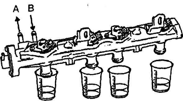 Рис. 2-168. Дроссельный узел системы питания двигателя F3R: 1 - датчик положения дроссельной заслонки; 2 - штекерный разъем; 3 - корпус; 4 - дроссельная заслонка; 5 - сектор; 6 - штуцера подвода охлаждающей жидкости; 7 - штуцер подвода картерных газов В связи с отсутствием в воздушном фильтре устройства сезонной регулировки температуры всасываемого воздуха, дроссельный узел оборудован системой подогрева, обеспечивающей стабильность температуры подаваемого в цилиндры двигателя воздуха и присоединенной к системе охлаждения двигателя шлангами. В корпусе 3 установлена на оси заслонка 4. На одном конце оси установлен датчик 1 положения дроссельной заслонки системы управления двигателем, а на другом - сектор 5, связанный посредством троса с педалью акселератора. В нижней части корпуса имеются два штуцера 6 для подвода жидкости из системы охлаждения двигателя и штуцер 7 для подключения шланга системы вентиляции картера. Диагностика и проверка системы впрыска топлива. При нарушении стабильной работы системы впрыска топлива, проявляющейся в виде снижении мощности двигателя, неустойчивых оборотах холостого хода, увеличении расхода топлива, проблемами с пуском и др. необходимо убедится в герметичности установки узлов системы и их работоспособности. Основные неисправности форсунки - это негерметичность клапана-распылителя и повреждение обмотки электромагнита. В первом случае из-за неплотной посадки клапана двигателя постоянно подается лишнее топливо в цилиндр, что вызывает переобогащение смеси. Во втором - при подаче импульса клапан не открывается и впрыска топлива не происходит. Исправность форсунки можно проверить следующим способом: 1. Отсоединить вакуумный шланг от регулятора давления топлива. 2. Отсоединить электрические разъемы от форсунок. 3. Отсоединить топливные шланги от штуцеров топливной рейки двигателя. 4. Отсоединить от воздушного ресивера впускной трубы двигателя кронштейн крепления жгута проводов систем двигателя и отвести его в сторону вместе со жгутом. 5. Отвернув две гайки крепления топливной рейки двигателя, аккуратно, стараясь не повредить резиновые уплотнительные кольца, вынуть его патрубки из отверстий головки блока цилиндров и вывести топливную рейку в направлении дроссельного узла. 6. Подсоединить к штуцерам топливной рейки двигателя гибкие топливные шланги системы питания. 7. Подставить под распылители форсунок емкости (рис. 2-169), включить электрический топливный насос без запуска двигателя, аналогично схеме проверки топливного насоса (см. рис. 2-163). Проверку проводить в течение 10 с. При этом из распылителей форсунок не должно появляться ни малейшего количества топлива.